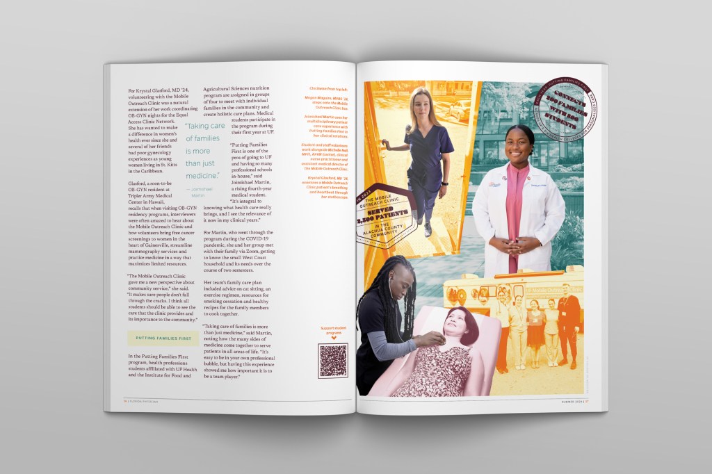 I used saturated colors and a lively, irregular photo collage approach to bring that energy to the page. This also allowed me to combine scenes and include contexts to help the photography speak more clearly. The resulting spreads convey the idea that these myriad community medicine programs work together to create a foundation of service for our students’ medical educations.