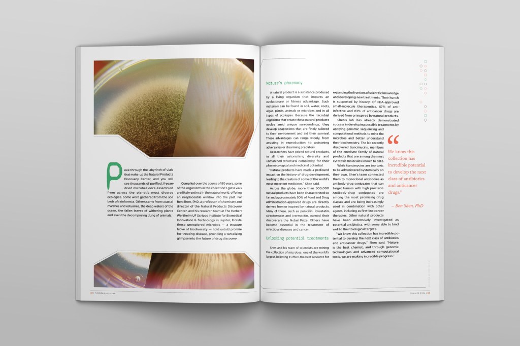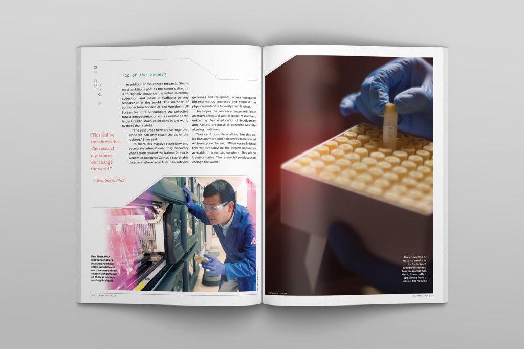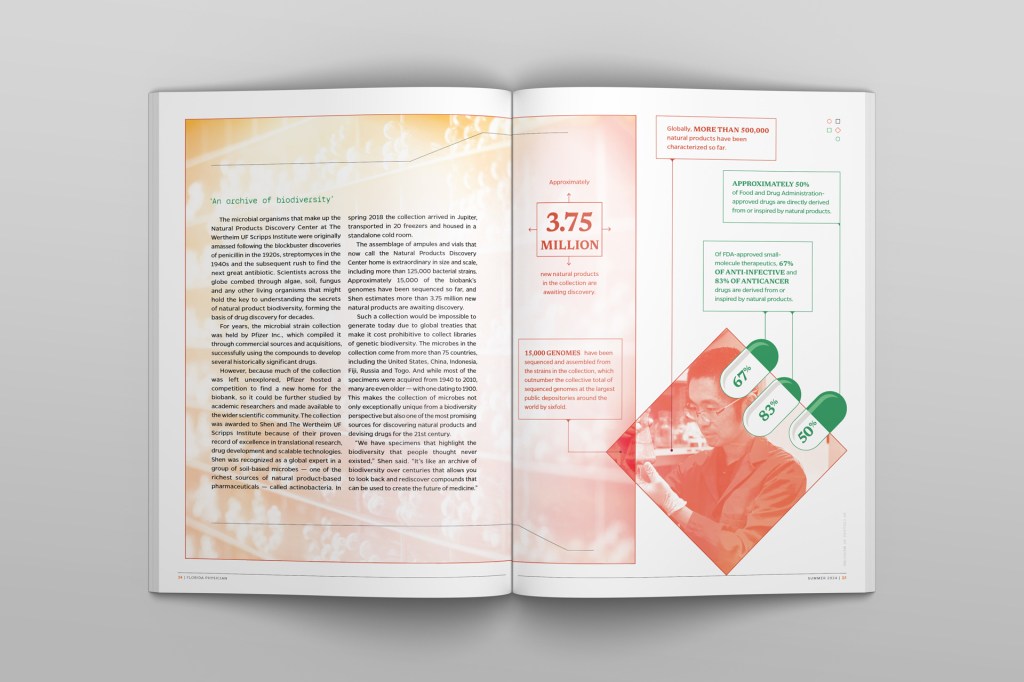 A secondary theme of the piece is the scale of the collection. Globally, around 500,000 natural products’ genomes have been sequenced thus far. The collection at UF Scripps accounts for 15,000 of those, with nearly 4 Million more samples awaiting characterization. I made an infographic out of the entire third spread of the piece to emphasize this. The box containing the copy represents the UF Scripps collection’s potential relative to the number of products already sequenced globally, and the overlap of the two shows just how much of the collection remains to be characterized. The green portions at the right illustrate the uses for natural products such as these, as well as the outsized proportion of medicines and cancer treatments that are created using natural product collections like the one at UF Scripps.